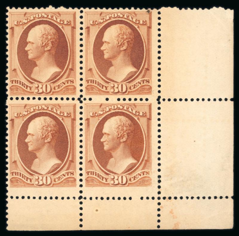 1887 30c orange-brown mint n.h. corner marginal block of four, the lower stamps jumbo size due to shifted perforation, a beautiful block of four. (Image)