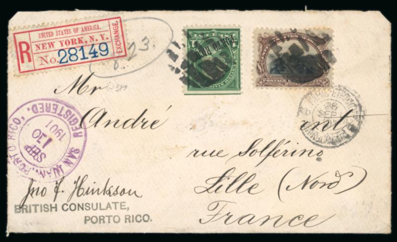 1901, registered letter franked with SG n° 298 and Puerto-Rico 1ct green x 5 for Lille (France), scarce mixed franking with nice cancellations on the back, address name erased otherwise very fine. (Image)