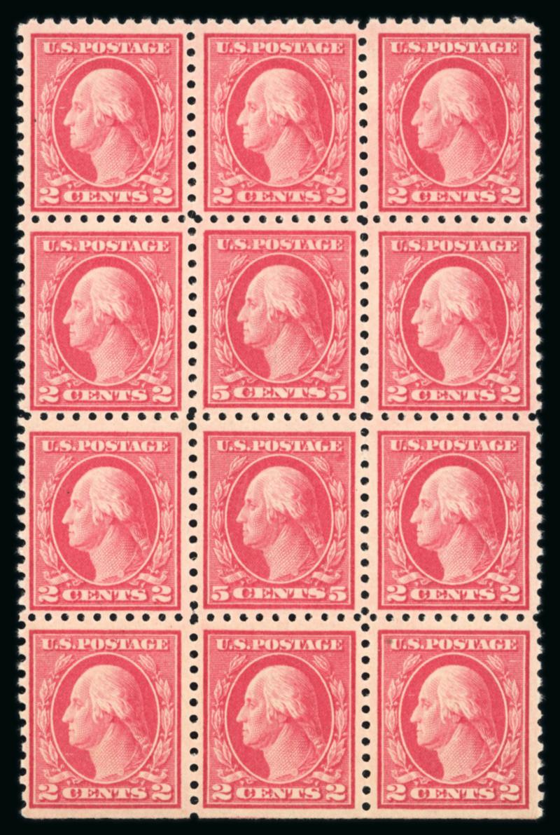 1917 5c rose error, two examples within a block of twelve 2c fine mint never hinged, ex. Weinman-Lays. (Image)