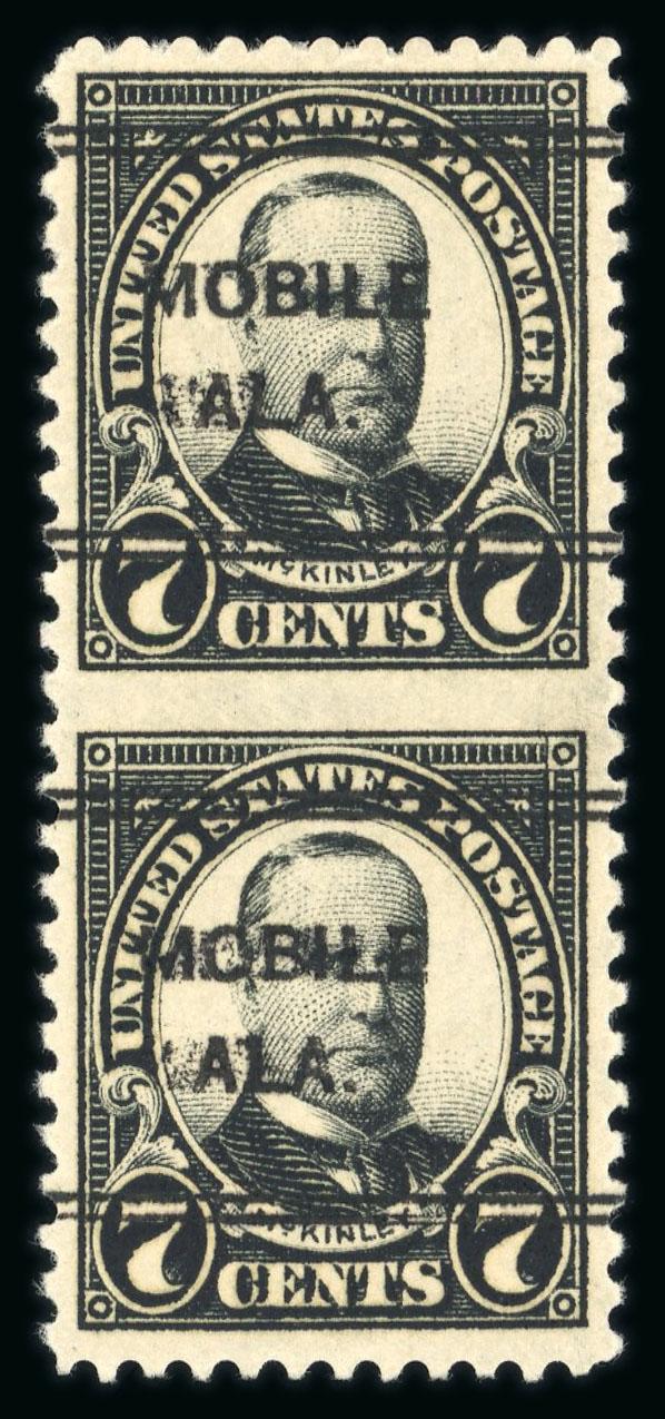 1926-34 McKinley 7c black vertical pair imperf between showing MOBILE/ ALA precancel, fresh hinged at top with lower stamp, slight horizontal crease, ex. Weinman-Lays. (Image)