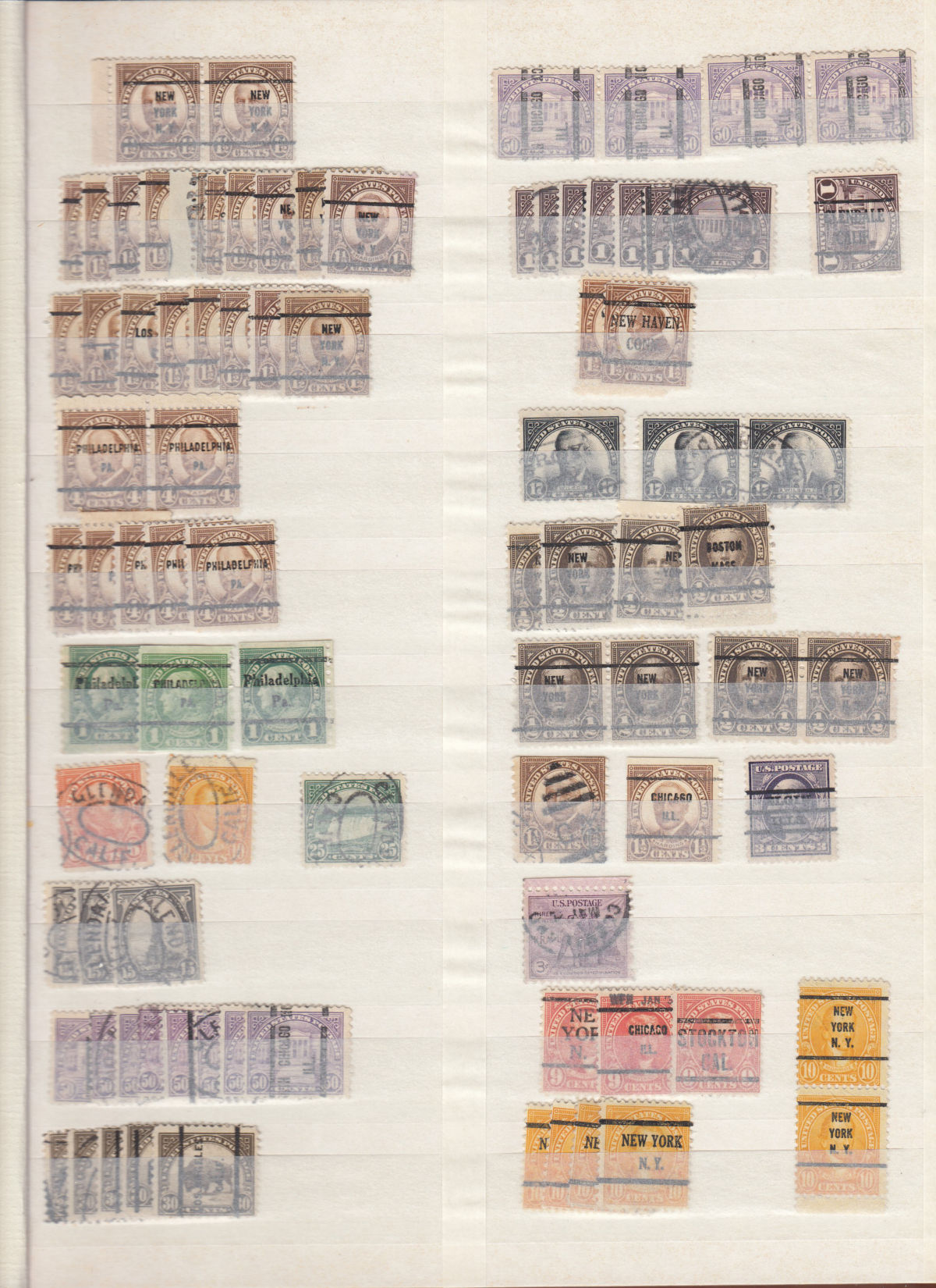 USA Album with ca 600 precanceled stamps, mostly from 1920´s to 1940´s. With many place cancels, many with duplicates and some in pairs or strip of 3. Quality varies and most without gum. $0 (Image)