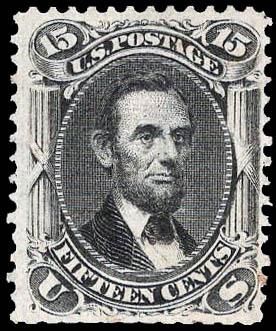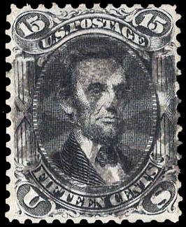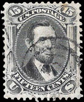 1867, 15¢ Lincoln, black, F. grill (Scott 98), black target cancel; small faults, Fine to Very Fine appearance. Scott $300. Estimate $60 - 80. (Image)