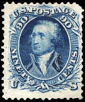 1861-66 (1875 Re-issue), 90¢ Washington, blue (Scott 111), a scarce original gum example of the 90¢ 1861 re-issue, o.g., hinged; a pulled corner perf at top right, otherwise Fine, with 2025 P.F. certificate, only 317 were sold. Scott $7,000. Estimate $1,200 - 1,800. (Image)