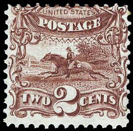 1869, 2¢ Postrider, brown (Scott 113), o.g., never hinged, Fine, with 2025 P.F. certificate, catalog value is for hinged, never hinged carries a premium. Scott $500. Estimate $150 - 200. (Image)
