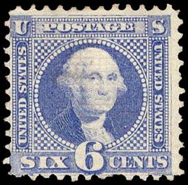1869, 6¢ Washington, ultramarine (Scott 115), pen cancel removed; short perf at bottom, Fine centering, with 2025 P.S.A.G. certificate. Scott $225. Estimate $50 - 75. (Image)