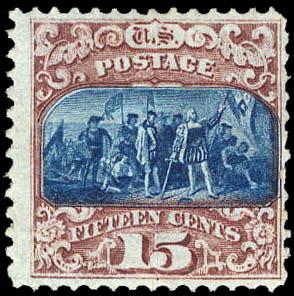 1869, 15¢ Landing of Columbus, brown & blue, type II (Scott 119), deep rich color, regummed, Fine, with 1991 P.F. certificate. Scott $1,000. Estimate $200 - 300. (Image)