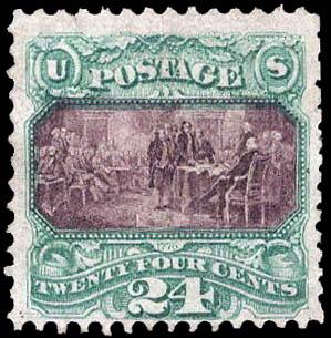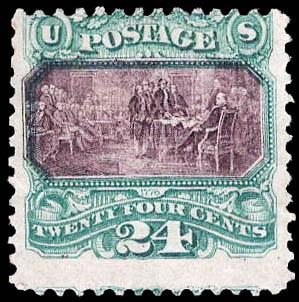 1869, 24¢ Declaration of Independence, green & violet (Scott 120), regummed; corner perf crease at lower left, Very Good, with 2011 A.P.S. certificate. Scott $3,000. Estimate $400 - 600. (Image)