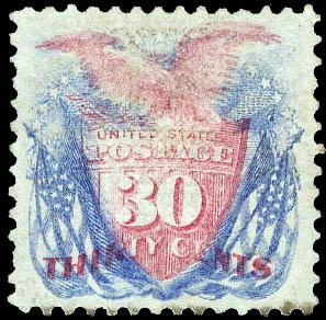 1869, 30¢ Shield, Eagle and Flags, ultramarine & carmine (Scott 121), beautifully well centered, unused without gum; faults including some toning at bottom, stains and tiny creases in margin, otherwise Very Fine, with 1973 P.F. certificate. Scott $1,400. Estimate $300 - 400. (Image)