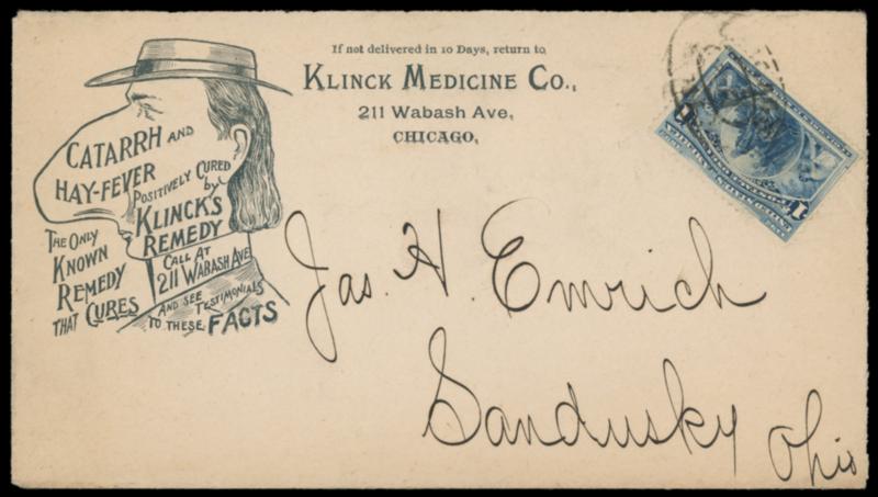 (Medical) Klinck Medicine Co., Chicago Ill., illustrated ad showing soldier with huge nose, reverse with red ad text, on cover bearing 1¢ Columbian (230) tied by "Chicago, Ill." third-class oval to Sandusky Ohio; flap missing, otherwise Very Fine. US$75-100 (Image)