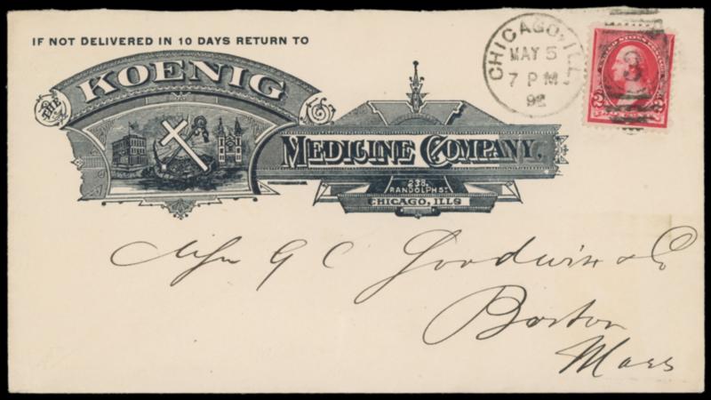(Medical) Koenig Medicine Co., Chicago Ill., large illustrated advertising corner card on 1892 cover bearing 2¢ carmine (220) tied by "Chicago Ill. May 5, 92" duplex to Boston Mass., Very Fine. US$75-100 (Image)