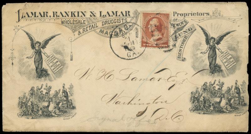 (Medical) Lamar, Rankin & Lamar, Wholesale & Retail Druggists, Macon Ga, overall illustrated ad showing Angels on large sized cover bearing 2¢ red brown (210) tied by "Macon Ga. Sep 21, 1885" cds duplex to Washington D.C., original matching letterhead enclosure to his cousin mentioning "I await the developments of the test case"; edge nicks and flaws, slightly reduced at right, Fine. US$100-150 (Image)