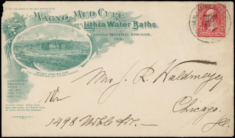 (Medical) Magno-Mud Cure and Lithia Water Baths, Indiana Mineral Springs, Ind., green illustrated building ad on cover bearing 2¢ carmine (279B) tied by "Indiana Mineral Springs, Ind. Apr 30, 1900" cds to Chicago Ill., additional text "Nature's Infallible Cure, For Rheumatism and Kindred Deseases"; reduced at left, F.-V.F. US$50-75 (Image)