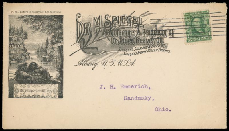 (Medical) Manufacturer & Proprietor of Dr Jones Beaver Oil, Dr. M Spiegel, Albany N.Y., two-panel illustrated advertising design on cover bearing 1¢ green (300) tied by "Albany N.Y. 1903" machine cancel to Sandusky, Ohio, light corner wrinkles at right, Very Fine. US$75-100 (Image)
