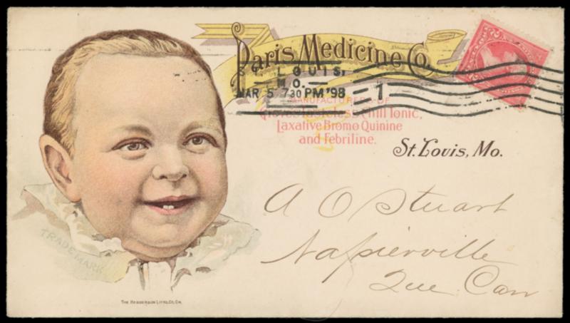 (Medical) Paris Medicine Co., St. Louis Mo., multicolor ad design showing baby and reverse red text for "Laxative Bromo Quinine tablets" on cover bearing 2¢ rose carmine (279Bc) tied by "St. Louis Mo., Mar 5 '98" machine cancel to Napierville Ind., Very Fine. US$150-200 (Image)