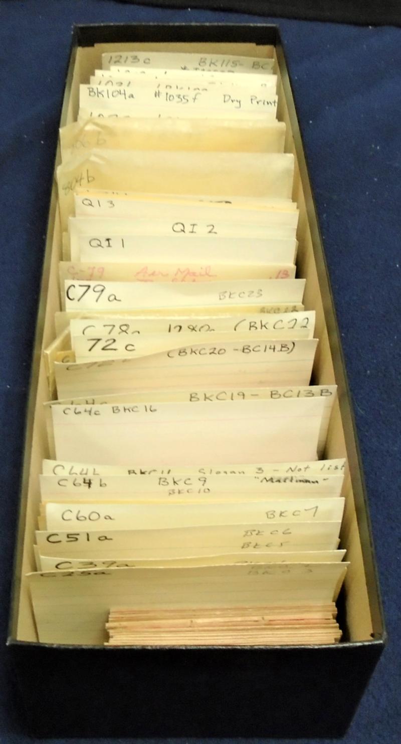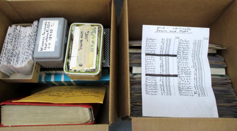 Two boxes of US precancels with 1,000’s of 1922 Bureau series, Washington Bicentennial, Liberty, Victory series. One box has a collection in four three-ring binders of US bureau precancels, two very well filled, and two binders of stock pages. Second box includes more bulk material in forty or so small boxes to be sorted into the albums; some unsorted; some divided up by state. Several pages of multiples included. Enough material to really enjoy the hunt. (Image)
