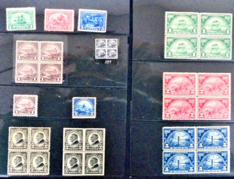 Ready, Set, Go. Very clean dealer’s stock of desirable, mostly pre-1950 U.S. plateblocks. Includes BOB. Enviable condition. Over 125 items. Mostly all different and almost all NH. Each plateblock placed into a sales sheet, identified, and priced. All housed in three small three-ring binders. Neat, sharp, and perfect for resale. (Image)