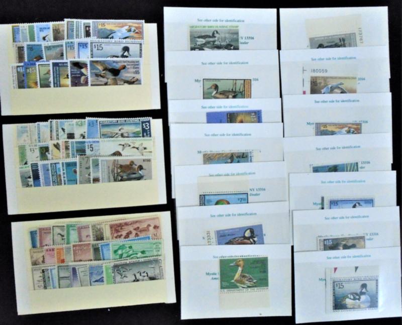 A selection of ducks worth viewing. The earlies are no gum and in mixed condition. Starting around the $5 stamps there is never hinged material. An interesting item is a panel of twenty RW 73. Duck collectors will flock to this material to inspect. (Image)