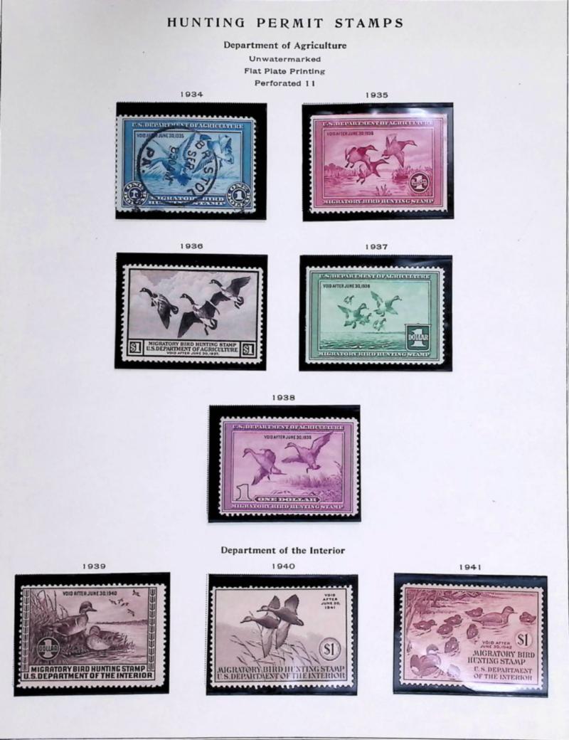 United States Federal Ducks selection complete in black mounts from 1934 to 1972 on Scott pages in a pizza-size box. RW1 canceled Bristol, PA, RW2 used, RW3-4 NH, and RW5 NH (thin). Mixture of mint and used after that having a few with condition issues. Still a respectable collection. (Image)