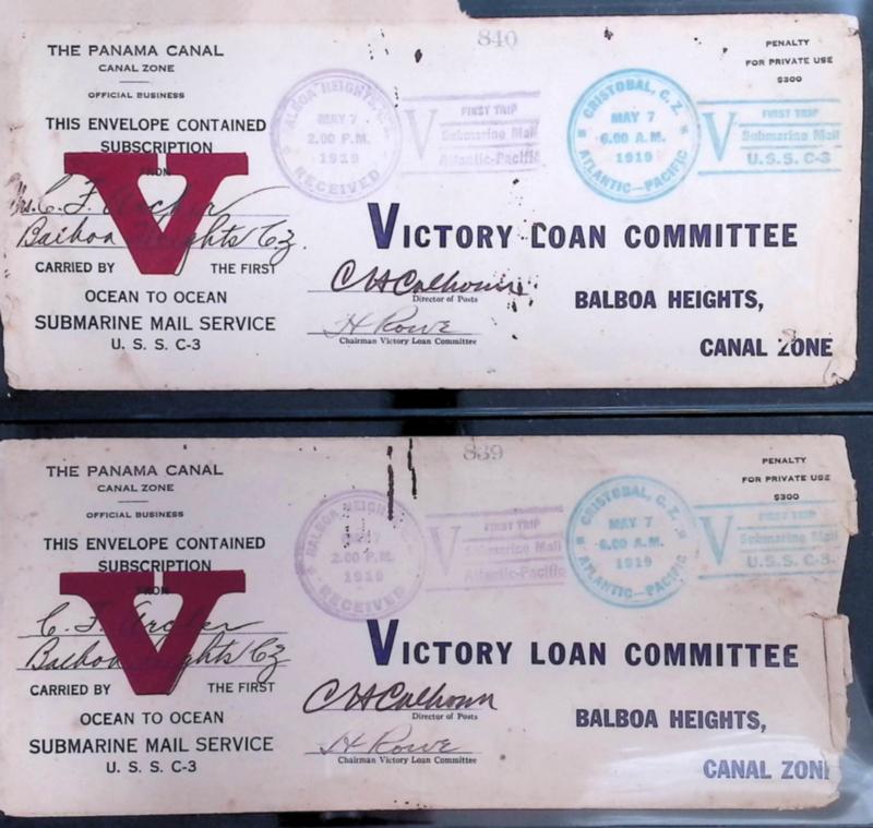 Two Canal Zone covers 1st Trip US Submarine Mail USS C-3 thru the Panama Canal canceled on May 7, 1919. Covers have foxing, toning, fraying, paper clip remains and one folded vertically middle which does not distract from their historical significance. Consecutive numbers of 839 and 840. Go for it. When will you see another pair? (Image)