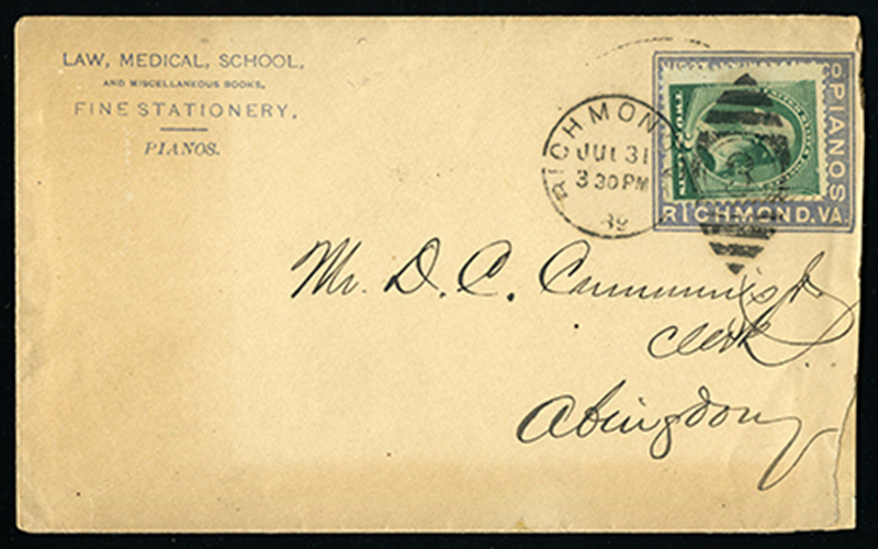 UNITED STATES OF AMERICA: 213: 2¢ green Washington tied inside West & Johnson BOOKS, STATIONERY & PIANOS illustrated ADVERTISING STAMP COLLAR cover from Richmond, VA 31 JUL 89 to Abingdon, somewhat toned and reduced at right, with letterhead contents, scarce. (Image)