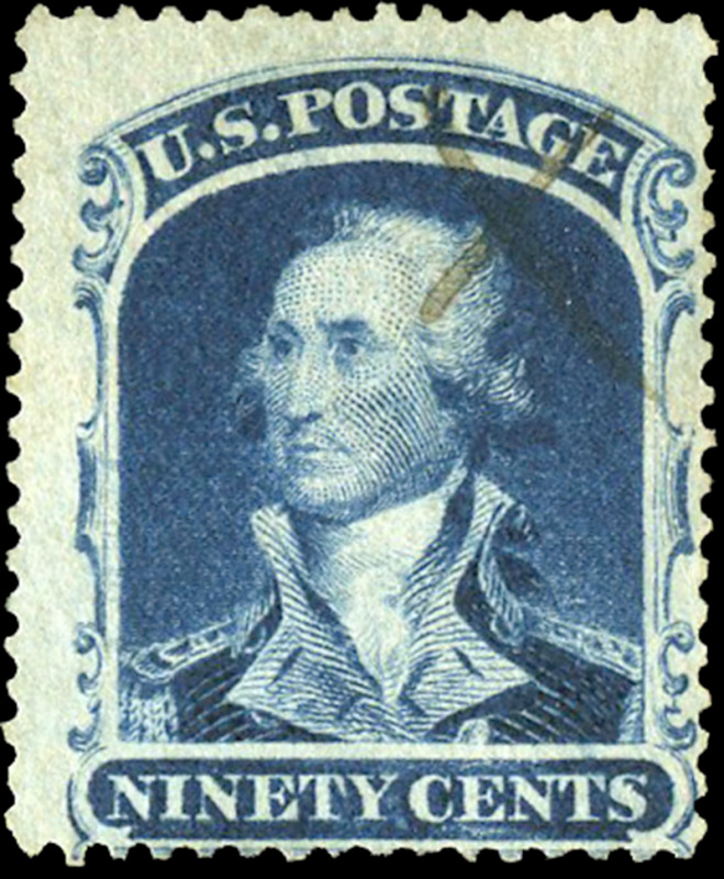 UNITED STATES OF AMERICA: 39: 90¢ Washington, blue, perfs just into at bottom, slight toning otherwise fine, with 2018 APS Cert stating "genuine, manuscript "X" cancel cannot be determined as contemporary." (Image)