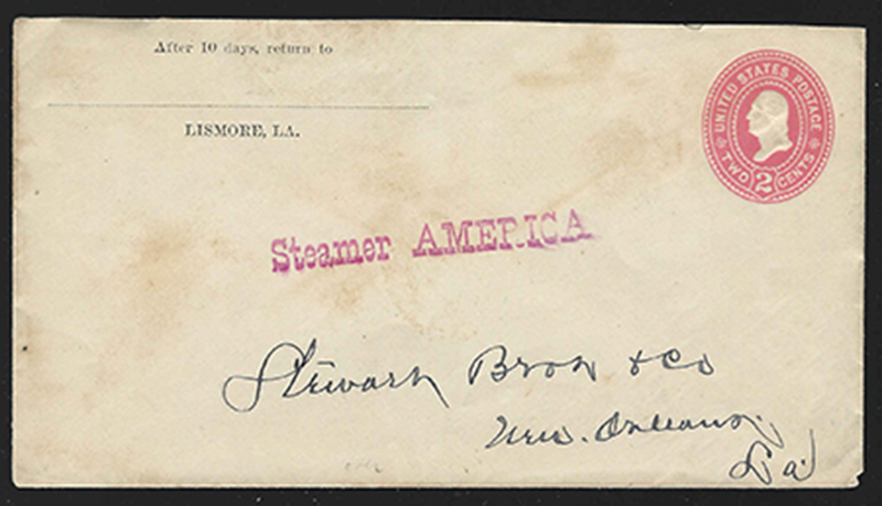 UNITED STATES OF AMERICA: 2¢ carmine stationery envelope (U358) uncancelled (citrca 1899)but addressed and used with ideal stike of magenta Steamer AMERICA straight line handstamp, small backflap fault and very light toning spots (negligible), still fine. (Image)