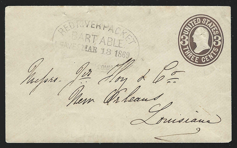 UNITED STATES OF AMERICA: 3¢ dark brown stationery envelope (U21), uncancelled but addressed to New Orleans with very fine strike of scarce RED RIVER PACKET, BART ABLE, LEAVES MAR 13 1869, ... COMMANDER oval handstamp, choice and very fine. (Image)