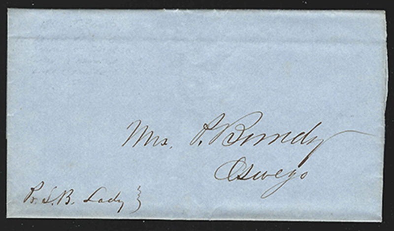 UNITED STATES OF AMERICA: 1843 Folded 'Bundy correspondence' letter written at Toronto 25 OC 1843, carried privately across Lake Ontario on the steamboat 'Lady of the Lake' to Oswego, with choice manuscript direction 'Pr S. B. Lady' lower left, very fine, ex Stulberg, Parsons. (Image)