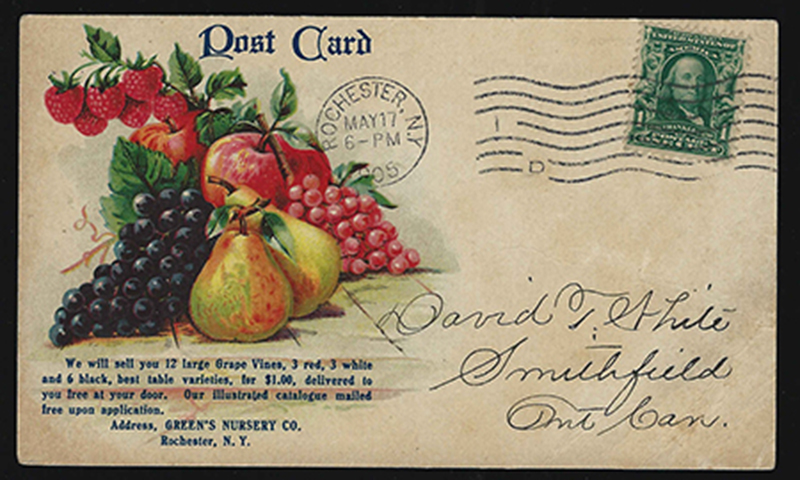UNITED STATES OF AMERICA: 300: 1¢ green tied to multicoloured illustrated FRUIT advertising postcard from Rochester 17 MY 1905 to Canada, light corner bend lower right, a very attractive postcard. (Image)
