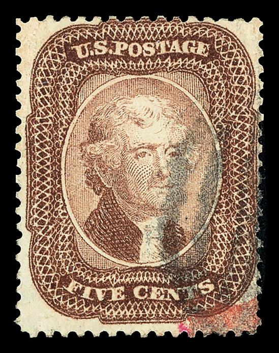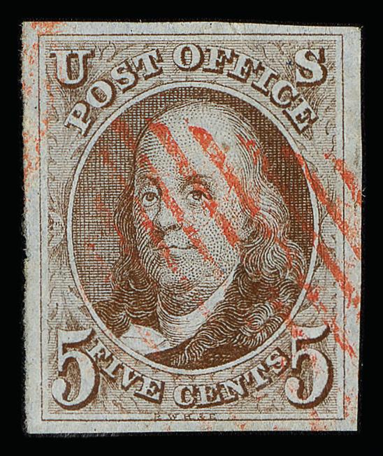 1847, 5¢ red brown (Scott 1), red New York square grid cancel, Extremely Fine, with 2006 P.S.E. certificate graded XF 90 & 1999 A.P.E.X. certificate. SMQ XF 90; $900. (Image)