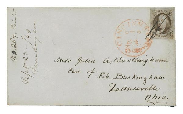 5¢ blackish brown (Scott 1a), Cincinnati, OH to Zanesville, OH, Very Good to Fine. Scott $1,500. (Image)