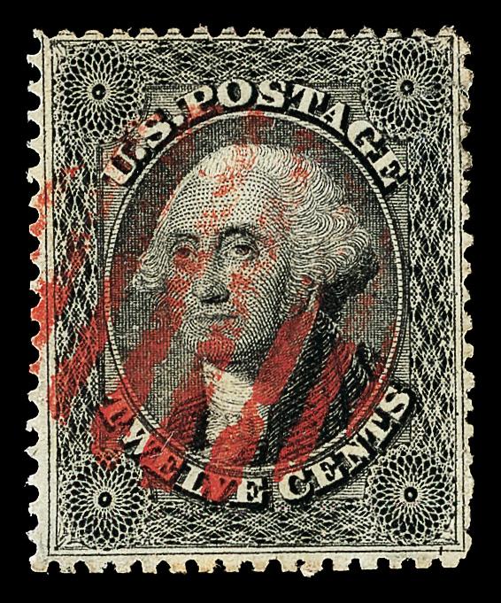 1857, 12¢ black, plate I (Scott 36), single, Red grid cancel.; Reperforated and a tear upper right, Fine, with 2008 P.S.E. certificate. Scott $320. (Image)