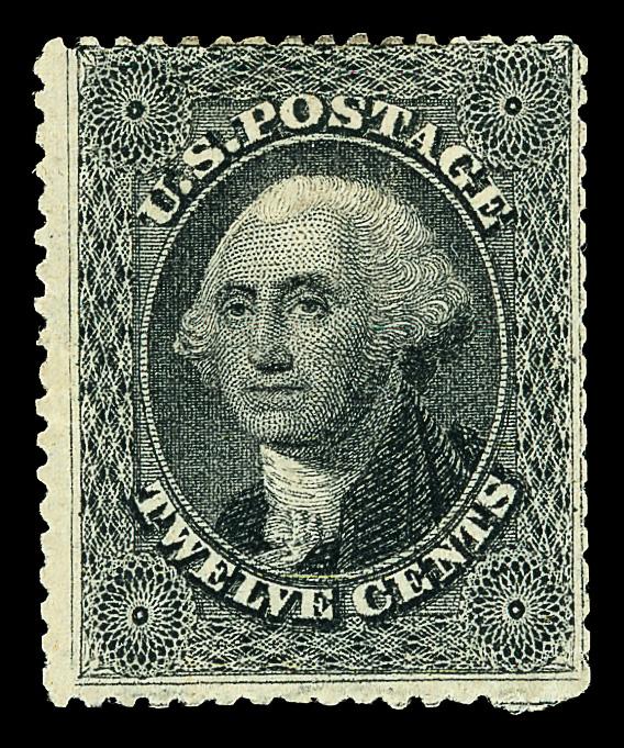 1859, 12¢ black, plate III (Scott 36B), o.g., hinge remnant, face-fresh example with intense color and razor-sharp detail, all nicely centered for this tough issue; thinned at middle left, otherwise Fine to Very Fine, with 2004 A.P.S. certificate. Scott $800. (Image)