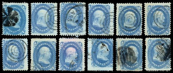 1861-67, 1¢ blue, group of 27 (Scott 63//92), for the student or dealer, offering a range of town, bullseye and fancy cancels; some grills included; some faults, Very Good to Fine. Scott $5,400. (Image)