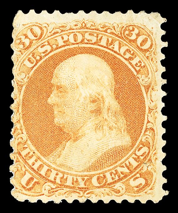 1861, 30¢ orange (Scott 71), single, part o.g.; With reinforced paper on lefted side, Fine. Scott $2,600. (Image)