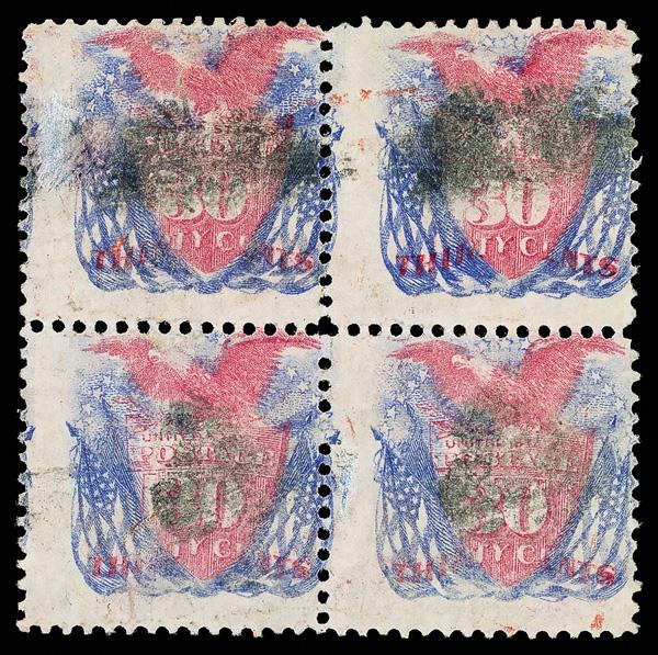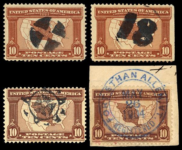 1904, 10¢ Louisiana Purchase Group of Sock-on-the-Nose Fancy Cancels (Scott 327), features four stamps with various cancels; an attractive group with some scarce examples. (Image)