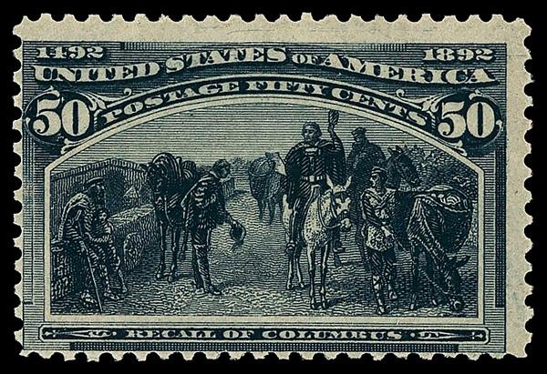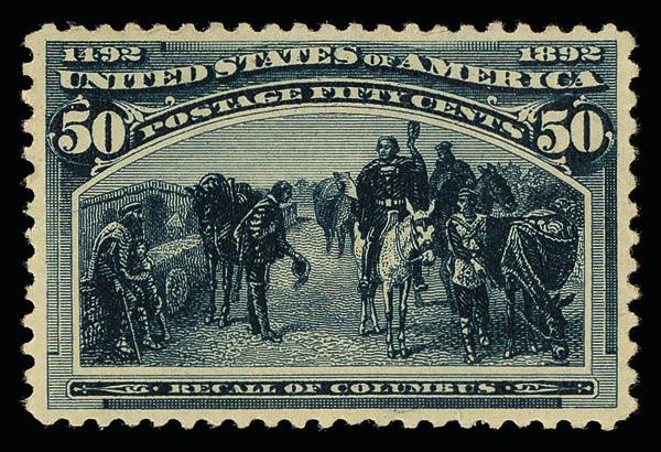 1893, 50¢ Columbian (Scott 240), o.g., very lightly hinged, Very Fine to Extremely Fine, with 2004 P.S.E. certificate graded VF-XF 85 & 1983 P.F. certificate with Richard Champagne letter. SMQ VF-XF 85; $650. (Image)