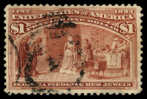 1893, $1 Columbian (Scott 241), attractive color and centering, lightly canceled; small tear at bottom center, otherwise Fine to Very Fine. Scott $525. (Image)