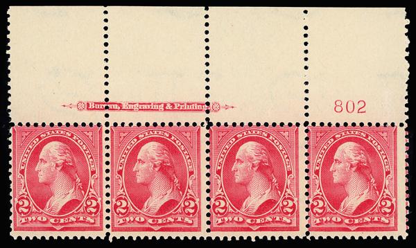 1898, 2¢ red, type IV (Scott 279B), full wide top margin plate number 802 and imprint strip of 4, o.g., never hinged, sound with clean detail and solid color along with over-sized selvage, Fine, The much scarcer imprint which covers four stamps. Scott $250 as hinged. (Image)