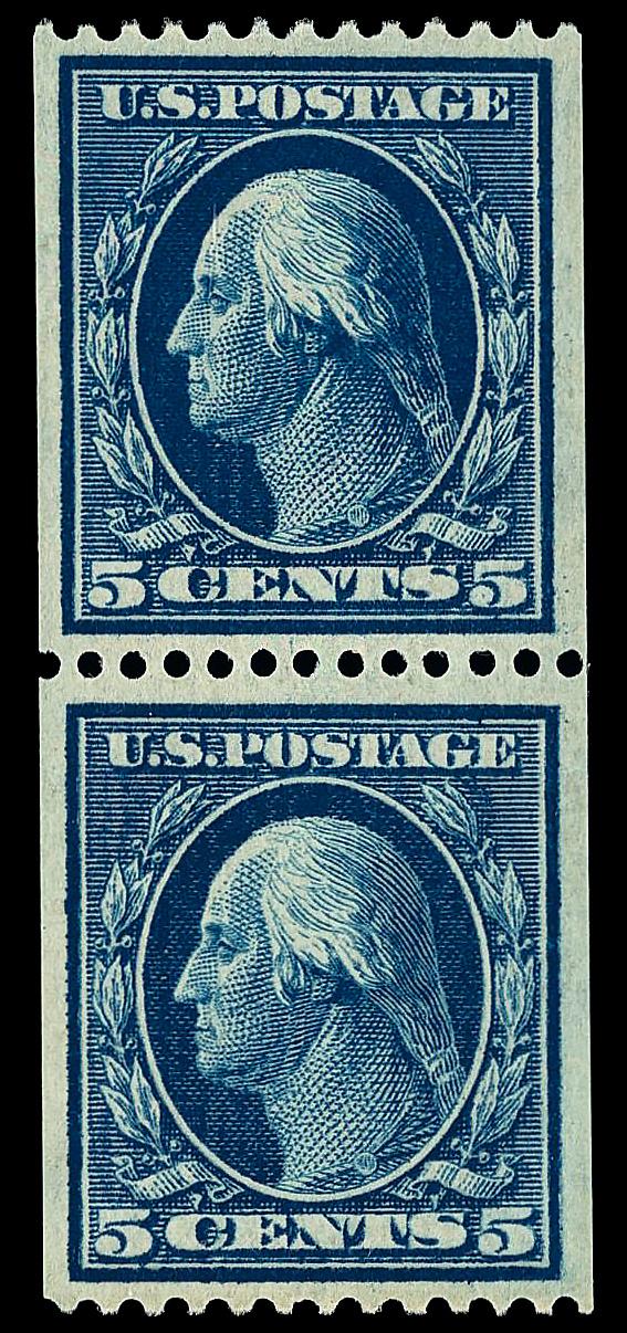1909, 5¢ blue, D.L. watermark, vertical coil, perf. 12 horizontally (Scott 351), pair, o.g., lightly hinged, Very Fine to Extremely Fine, with 1990 P.F. certificate. Scott $425. (Image)