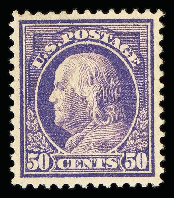 1914, 50¢ violet, S.L. watermark, perf. 12 (Scott 421), o.g., hinged, Extremely Fine, with 2004 P.S.E. certificate graded XF 90 & 2000 P.S.E. certificate for block of which this is the UR stamp. SMQ XF 90; $550. (Image)