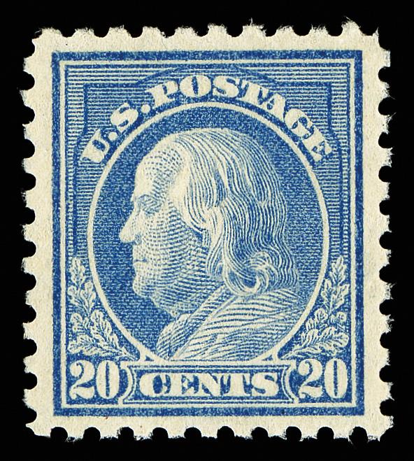 1914, 20¢ ultramarine, S.L. watermark, perf. 10 (Scott 438), o.g., lightly hinged, Post Office fresh with vibrant color and clean impression, sound and pristine, Very Fine to Extremely Fine, with photocopy of 2025 P.F. certificate graded VF-XF 85 for block of four, this position 1. SMQ VF-XF 85; $225. Scott $200. (Image)