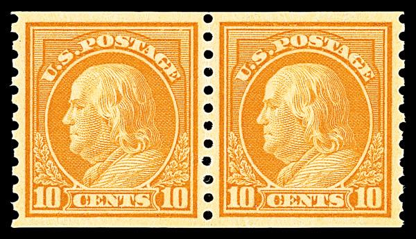 1922, 10¢ orange yellow, unwatermarked, rotary press coil, perf. 10 vertically (Scott 497), pair, o.g., never hinged, Post Office fresh with radiant, day-one-fresh color; left stamp with a small perforation indentation at bottom right, otherwise Extremely Fine to Superb, ex Laehder, with 1992 P.F. certificate. Scott $85. (Image)