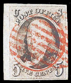 1847, 5¢ Franklin, red brown (Scott 1), a beautiful example, with large margins all around including sheet margin at left, and a neat red grid cancel, Very Fine to Extremely Fine, with 2011 P.S.E. certificate. Scott $425. (Image)