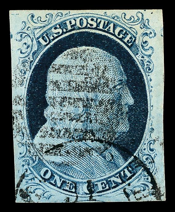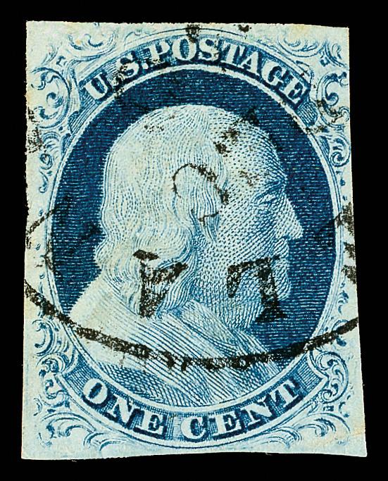 1852, 1¢ blue, type IV (Scott 9), position 8R1L, "T" Relief, a lovely stamp with immense color on like-new paper; light circular grid cancel and partial foreign transit marking, Extremely Fine, signed A. Brun and another, with 2025 Crowe certificate graded XF 90. SMQ XF 90; $200. Scott $100. (Image)