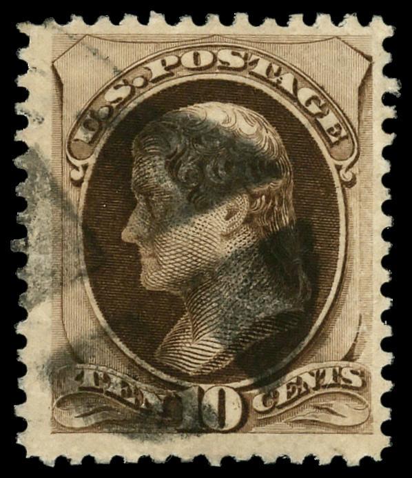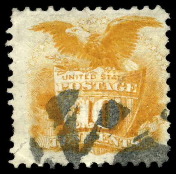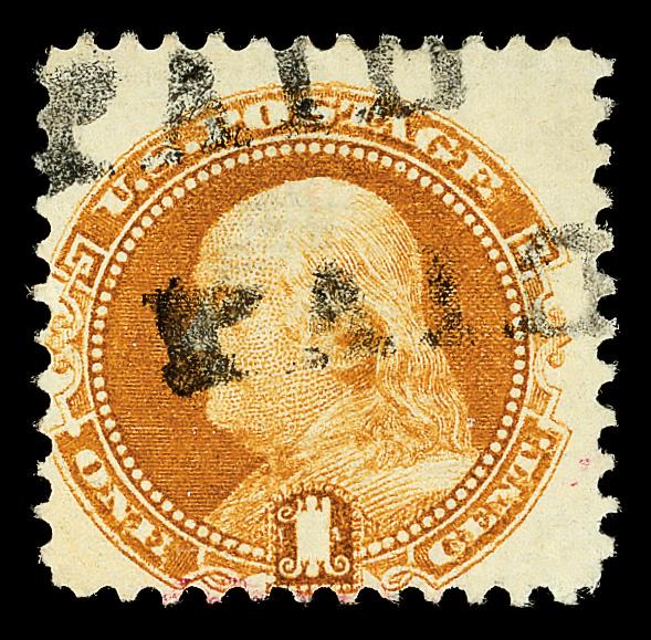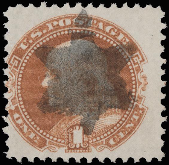 1869, 1¢ buff, Small solid 6-point star (Scott 112), a perfect strike right in the center, otherwise Very Fine. Scott $160. (Image)