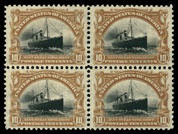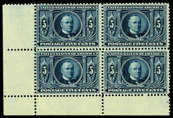 1904, 5¢ Louisiana Purchase (Scott 326), bottom left corner margin block of 4, astonishingly fresh, o.g., never hinged, Fine. Scott $720. (Image)