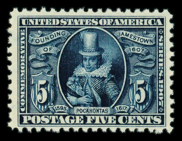 1907, 5¢ Jamestown (Scott 330), o.g., lightly hinged, Fine to Very Fine. Scott $150. (Image)