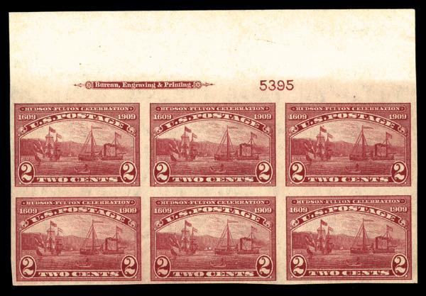 1909, 2¢ Hudson-Fulton, imperf. (Scott 373), plate block of 6, o.g., never hinged, Fine to Very Fine. Scott $375. (Image)