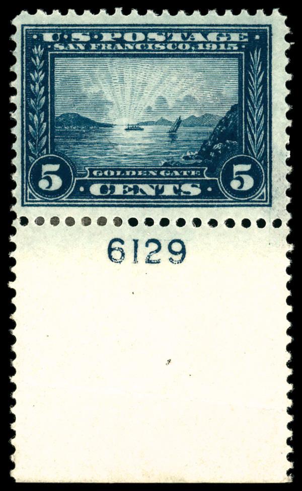 1913, 5¢ Panama-Pacific, perf. 12 (Scott 399), plate number single, o.g., hinge remnant, Fine. Scott $70. (Image)